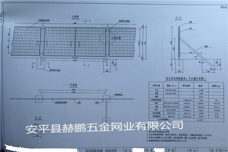 说明:1.图中尺寸均以mm为单位。 2.网片采用冷拔钢丝电焊网 3.立柱为玻璃钢材料,颜色为浅绿色,抗折荷载力、冻融抗折荷能力>6100N。 4.中间立柱每隔50M左右设置一组D型斜撑。端头立柱设置一组B型斜撑。 5.隔离栅设置在公路用地范围界限以内1250px处。 立柱:50*60,厚度:2.5mm,3.5mm/4.5mm/5.5mm