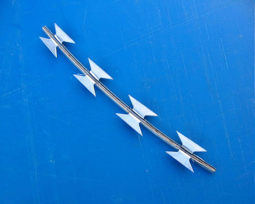刀片刺绳也称为刀片刺丝、刀片刺网,是一种新型防护网。刀片刺绳具有美观、经济实用、防阻效果好、施工便利等优异特点,目前,刀片刺绳已被广泛应用于许多国家的工矿企业,园林公寓,边防哨所,军事领域,监狱,看守所,政府建筑物和其他国家的安全设施。 规格如下 | 规格 | 形状 | 刀片厚 | 心线直径 | 刀长 | 刀宽 | 刀间 | | BTO-12 | | 0.5±0.05 | 2.5±0.1 | 12±1 | 13±1 | 26±1 | | BTO-18 | | 0.5±0.05 | 2.5±0.1 | 18±1 | 15±1 | 33±1 | | BTO-22 | | 0.5±0.05 | 2.5±0.1 | 22±1 | 15±1 | 34±1 | | CBT-65 | | 0.5±0.05 | 2.5±0.1 | 65±2 | 21±1 | 100±2 |