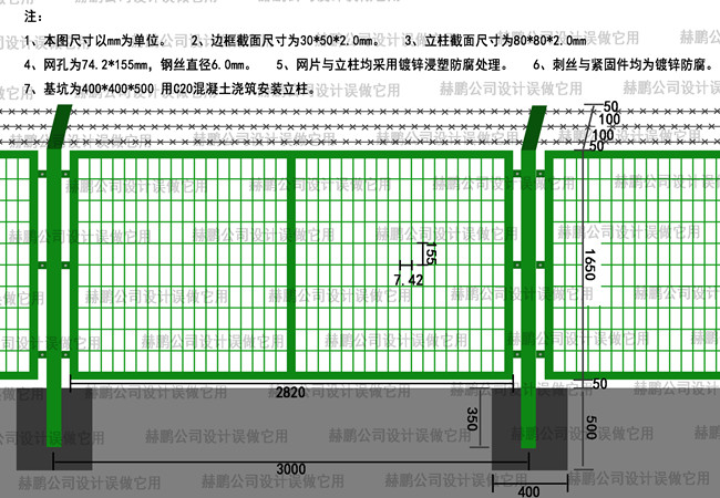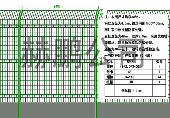 隔离栅立柱部分由∮48*3mm(浸塑前)的焊接钢管加工制成,立柱高度 2200mm,隔离栅网片部分由