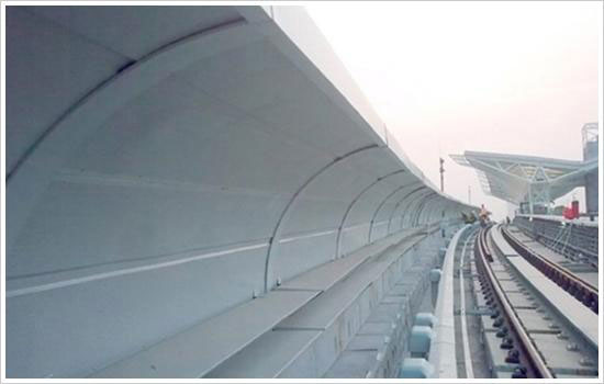 大弧声屏障特点: 隔声量大:平均隔声量37dB。 吸声系数量:最高吸声系数0.95. 耐候耐久性:产品具有耐水性,耐热性,抗紫外线,不会因雨水温度而变化引起降低性能或品质异常. 美观:可选择多种色彩和造型进行组合,与周围环境协调,形成亮丽风景线。 经济:装配式施工,提高工作效率,缩短施工时间,可节省施工费。 方便:与其他制品并行安装,易维修,更新方便。 安全:吸声板两端可用钢丝绳连接固定,防止二次损伤,造成人员,财产的损失。 轻便:大弧声屏障产品具有自重轻特点,每平米质量低于25公斤,可减轻高架轻轨,高架路的承重负荷,可降低结构造价。 防火:采用超细玻璃棉,由于其熔点高,不可燃,完全满足环保和防火规范要求,防火等级达A级。 高强度:结合我国各地区不同的气候条件,在结构设计时充分考虑风荷载。通过自动生产线,压制凹槽以增加强度,使产品抗10-12级台风,抗风压300kg/㎡。 防水,防尘:百叶型设计时充分考虑防水,防尘,其角度设为45°,在扬尘或淋雨环境中其吸声性不受影响,结构中已设置排尘排水措施,避免构件内部积水。 耐用:大弧声屏障设计已充分考虑了道路的风荷载,交通车辆的撞击安全和全天候的露天防腐。