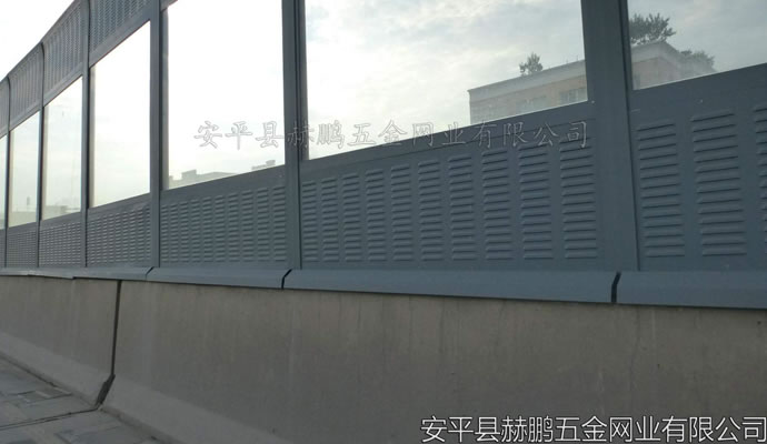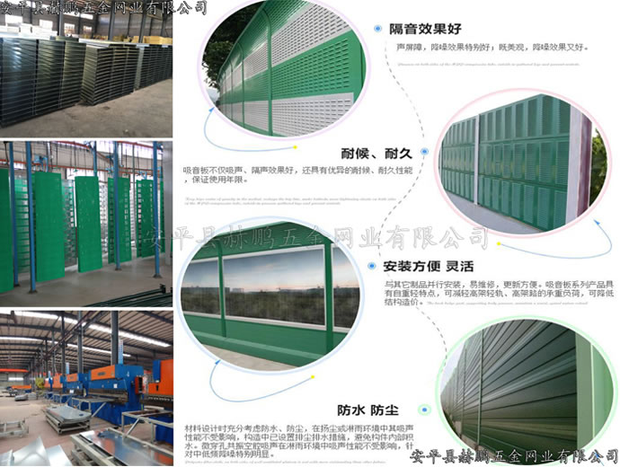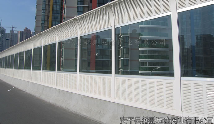 高速声屏障主要用于高速公路、高架复合道路、城市轻轨地铁等交通市政设施中的隔声降噪、控制交通噪声对附近城市区域的影响,也可用于工厂和其它噪声源的隔声降噪。声屏障高度在1m一5m间,覆盖有效区域平均降噪达10~15dB(A)(125Hz~40000Hz,1/3倍频程),最高达20dB(A)。一般来讲,声屏障越高,或离声屏障越远,降噪效果就越好。 声屏障材料选用总的原则是降噪效果性能良好、结构安全可靠、材料价格经济、安装成本低、经久耐用、使用寿命长、景观协调、美观大方等方面。具体说明如下: (1)隔声量大:平均隔声量应不小于35dB; (2)吸声系数高:平均吸声系数应不小于0.84; (3)耐侯耐久性:产品应具有耐水性、耐热性、抗紫外线、不会因雨水温度变化引起降低性能或品质异常。产品采用铝合金卷板、镀锌卷板、玻璃棉、H钢立柱表面镀锌外理防腐年限在15年以上。 (4)美观:可选择多种色彩和造型进行组合,与周围环境协调,形成亮丽风景线。 (5)经济:装配式施工,提高工作效率,缩短施工时间,可节省施工费及人工费。 (6)方便:与其它制品并行安装,易维修,更新方便。 (7)轻便:吸音板系列产品具有自重轻特点,可减轻高架轻轨、高架路的承重负荷,可降低结构造价。 (8)防火:采用超细玻璃棉,由于其熔点高,不可燃,完全满足环保和防火规范的要求。 (9)高强度:结合我国各地区不同的气候条件,在结构设计时充分考虚风荷载。通过生产线压制凹槽增加强度。 (10)防水、防尘:材料设计时充分考虑防水、防尘,在扬尘或淋雨环境中其吸声性能不受影响,构造中已设置排尘排水措施,避免构件内部积水。微穿孔共振空腔吸声在淋雨环境中吸声性能不受影响,针对中低频降噪特别明显。 (11)耐用:产品设计已充分地考虑了道路的风载、交通车辆的撞击安全和全气假的露天防腐。产品采用铝合金卷板、镀锌卷板、玻璃棉、H钢立柱表面镀锌处理。在质保期内不腐蚀、不变型、吸声、隔声效果不降低。