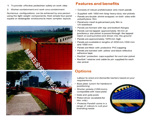 临时围栏 临时围栏海关编码:73144100 横向临时围栏支撑(风撑)。 Application of bracing is every third panel.The short panel section are 300mm wide and are designed to be instailed transversely to the run of fencing, at the joint betweent two panets. 应用支撑每第三板。短板段300mm宽的目的是要instailed横向击剑的运行,在连接两个醋氨酚之间。parts and shipping weight 部分装运重量A standard package of Protecta Panels includes 42 panels with approximately.99m run of barner as well as star pickets.Reosok caps,retainers and latching pins comes on a 2.4m-long timber pallet.The shipping weight of this package is 430kg and the dimensions are2250*1200*1050mm higt. 一个标准的包装该临时围栏包括42个临时围栏给出approximately.99m运行以及明星纠察。防雨帽,移动护栏和锁存引脚是2.4m木托盘。 这个包的重量和尺寸是430kg are2250×1200×1050mm高。 Protecta Panels'M Star pickets